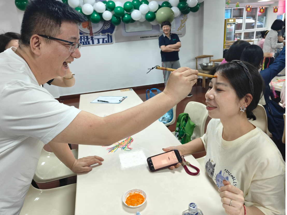 除了包粽子外,還組織了縫香包、編蛋袋、撞蛋、點額等形式多樣的活動。其中點額儀式則是端午節(jié)活動中的一項重要儀式。現場擺放著雄黃酒和艾草制品,大家將雄黃酒點在額頭、耳后、手腕等處,雄黃酒香氣四溢、艾草清香撲鼻,構成了端午獨特的氣息,這不僅是對傳統文化的尊重與傳承,更是讓我們在現代生活中仍感受到那份來自古代的智慧與關懷。